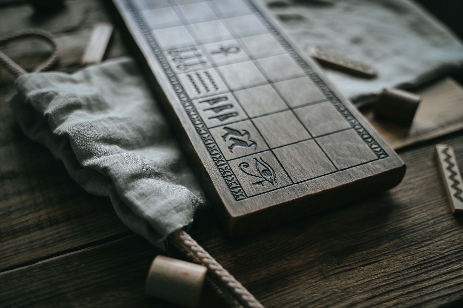 - Herná doska (3x10 polí): Vyrobená z jedného kusu bukového masívu s vypaľovanými a symbolmi na kľúčových poliach.